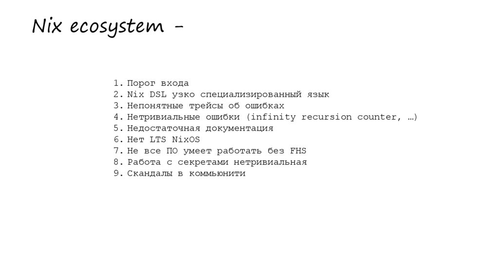 Nix ecosystem 1. Порог входа2. Nix DSL узко специализированный язык