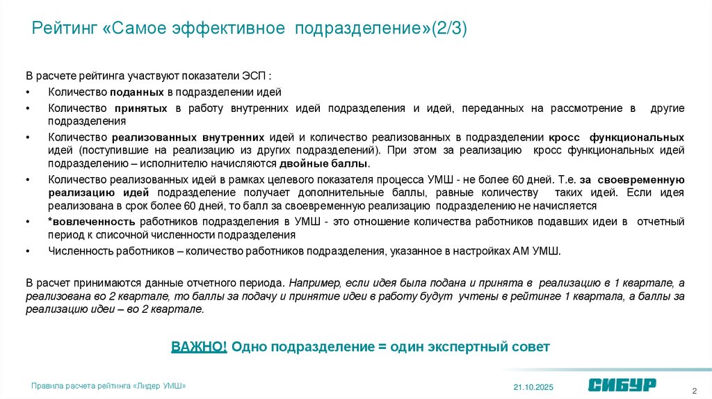 Рейтинг «Самое эффективное подразделение»(2/3)В расчете рейтинга участвуют показатели ЭСП :