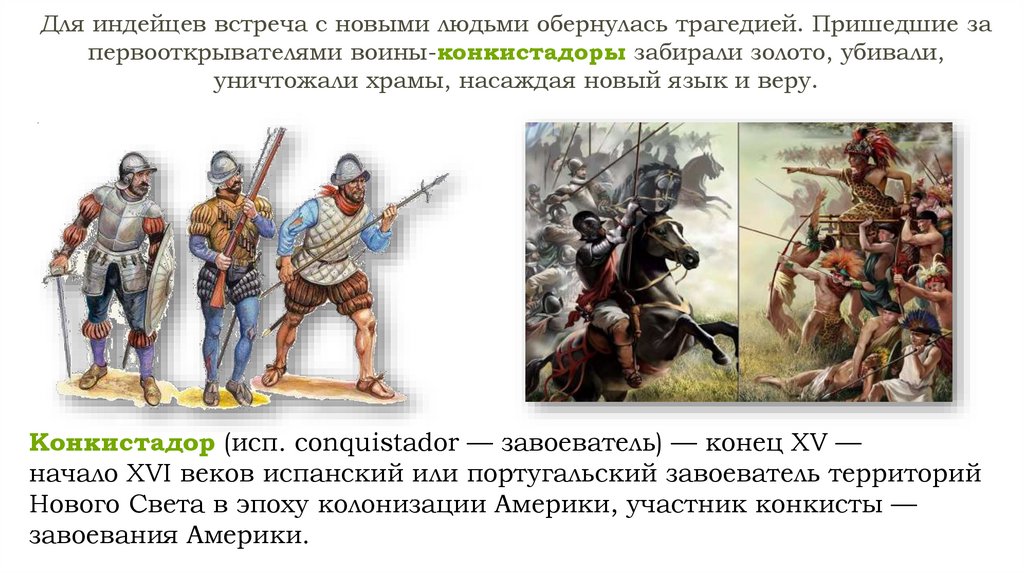 Для индейцев встреча с новыми людьми обернулась трагедией. Пришедшие запервооткрывателями воины-конкистадоры забирали золото, убивали,