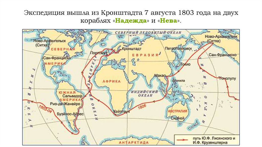 Экспедиция вышла из Кронштадта 7 августа 1803 года на двухкораблях «Надежда» и «Нева».