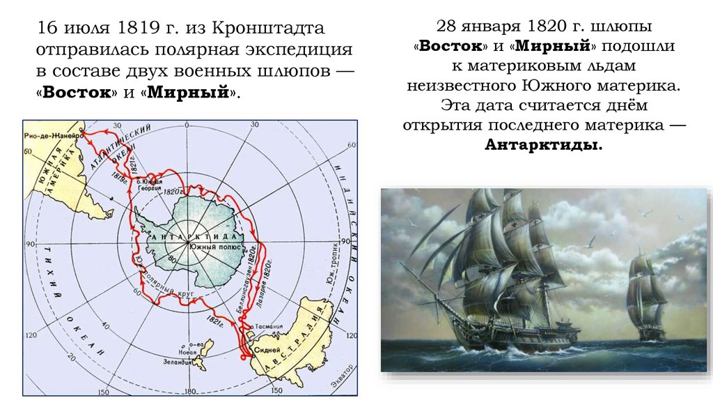 Открытие АнтарктидыОткрытие самого южного материка совершили русские путешественники.