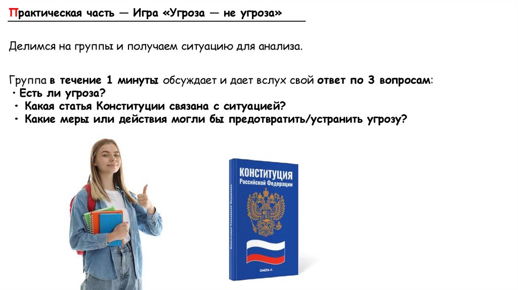 Практическая часть — Игра «Угроза — не угроза»Делимся на группы и получаем ситуацию для анализа.