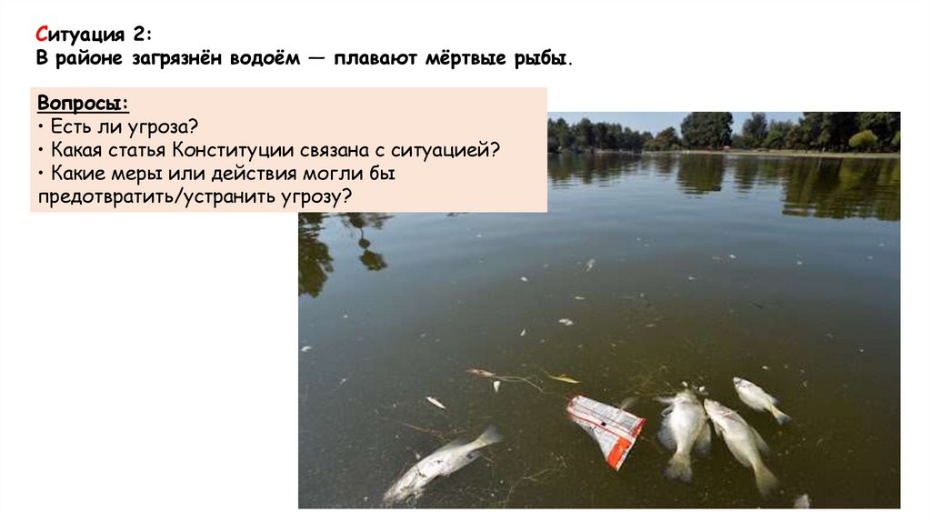 Ситуация 2:В районе загрязнён водоём — плавают мёртвые рыбы.