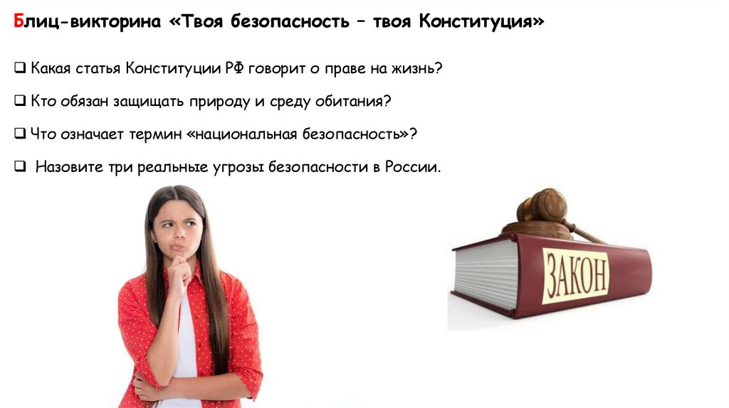 Блиц-викторина «Твоя безопасность – твоя Конституция»Какая статья Конституции РФ говорит о праве на жизнь?