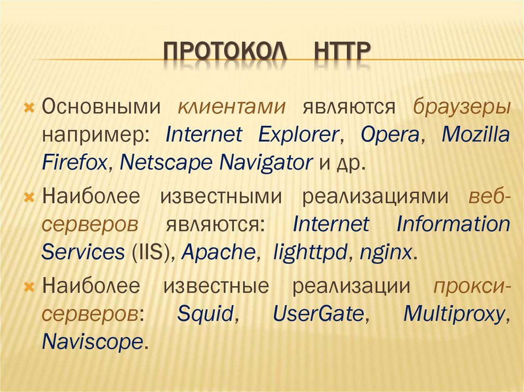 HTTP (HyperText Transfer Protocol - RFC 1945, RFC 2616) —протокол прикладного уровня для передачи гипертекста.