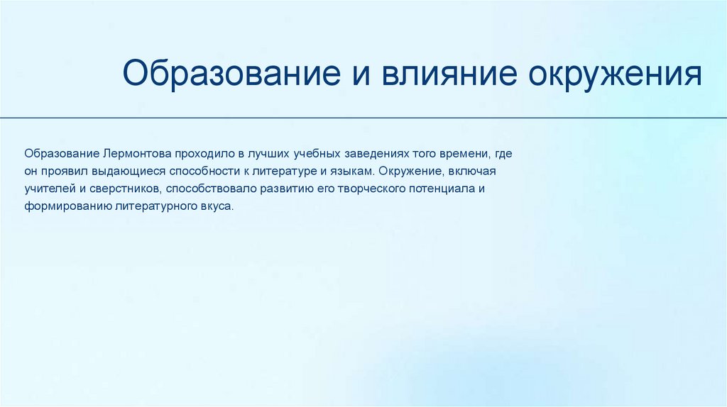 Образование и влияние окруженияОбразование Лермонтова проходило в лучших учебных заведениях того времени, где