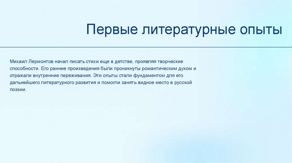 Первые литературные опытыМихаил Лермонтов начал писать стихи еще в детстве, проявляя творческие