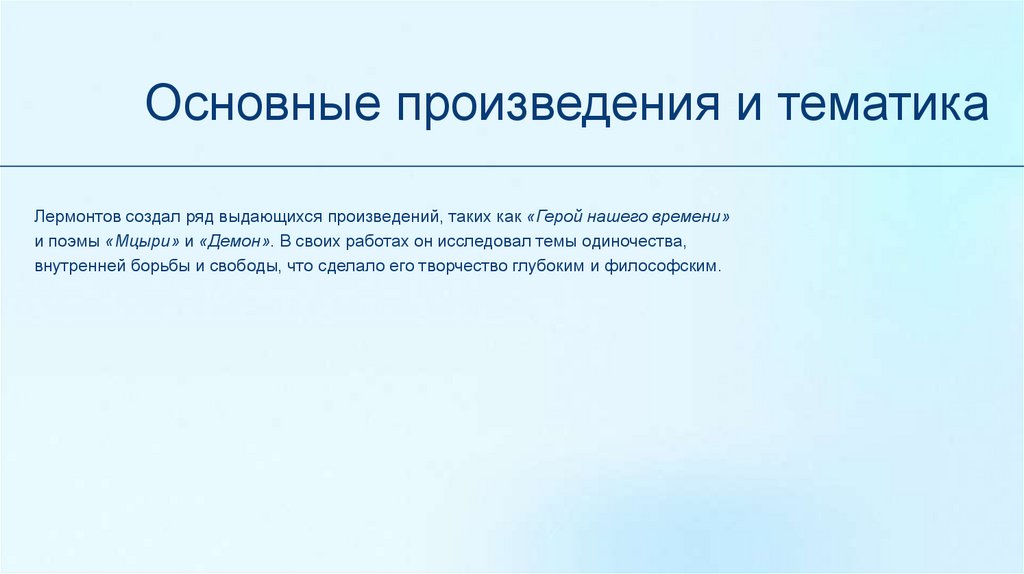 Основные произведения и тематикаЛермонтов создал ряд выдающихся произведений, таких как «Герой нашего времени»