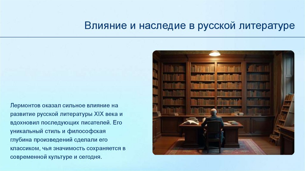 Влияние и наследие в русской литературеЛермонтов оказал сильное влияние на