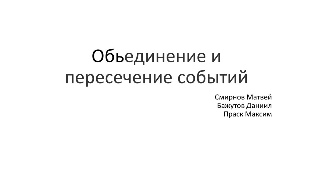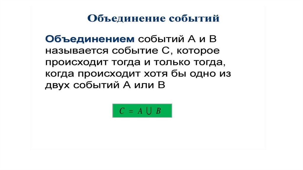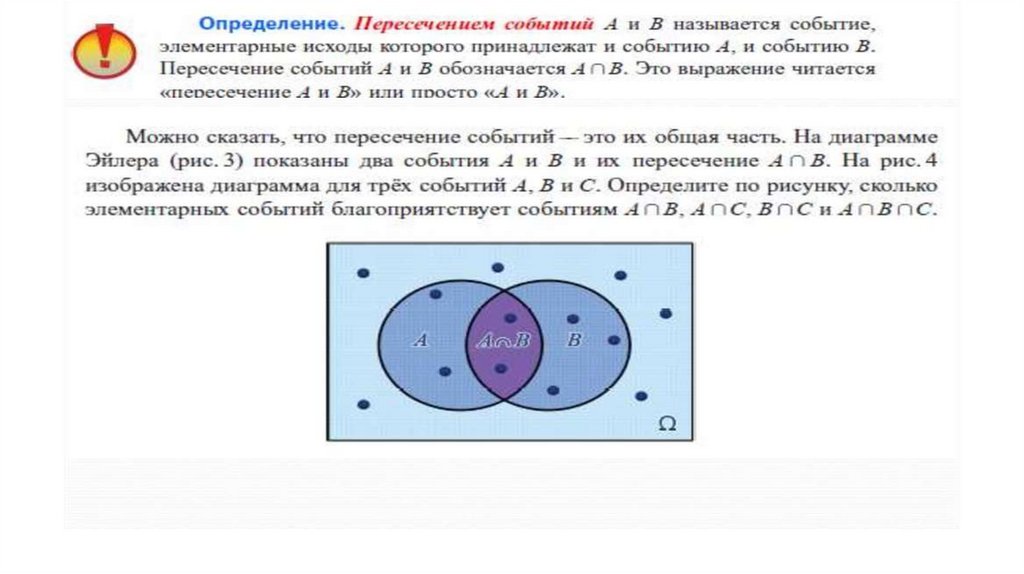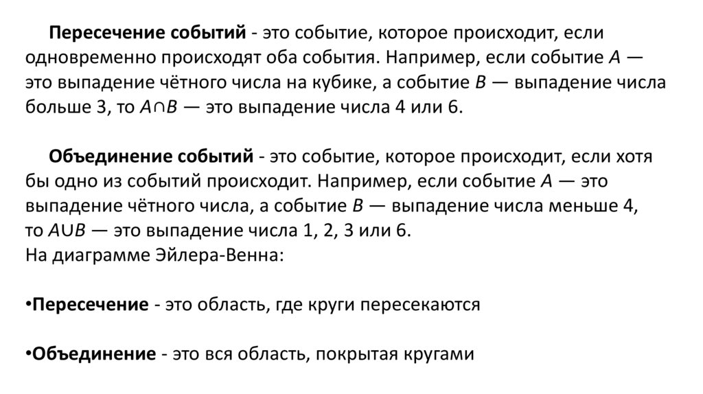Пересечение событий - это событие, которое происходит, еслиодновременно происходят оба события. Например, если событие A —