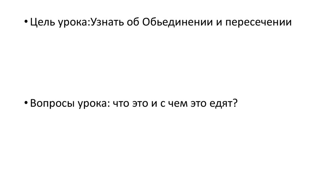 • Цель урока:Узнать об Обьединении и пересечении• Вопросы урока: что это и с чем это едят?