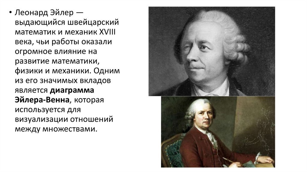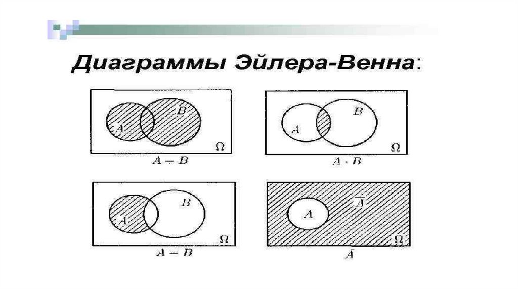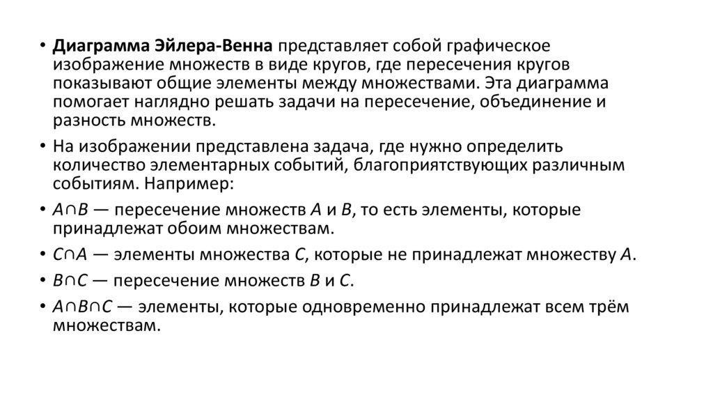 • Диаграмма Эйлера-Венна представляет собой графическоеизображение множеств в виде кругов, где пересечения кругов