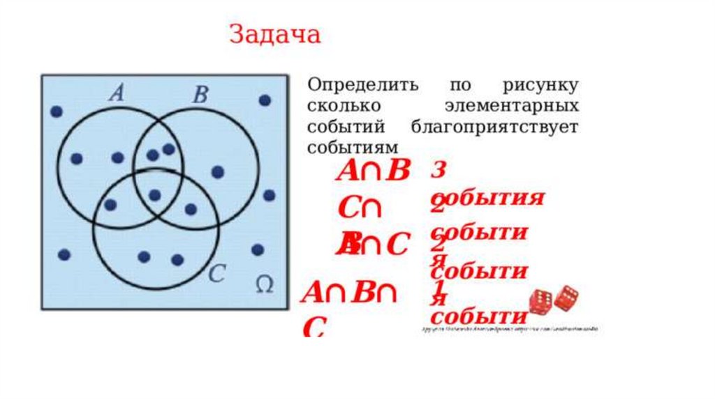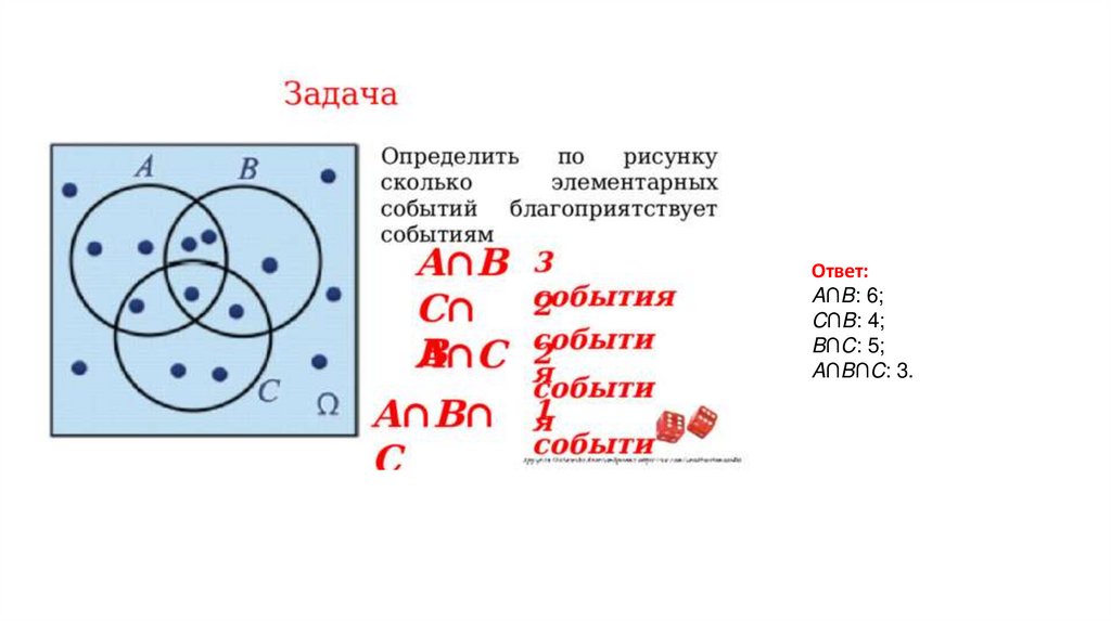 • A∩B∩C — элементы, которые одновременно принадлежат всем трём