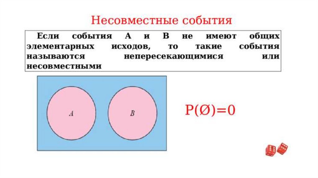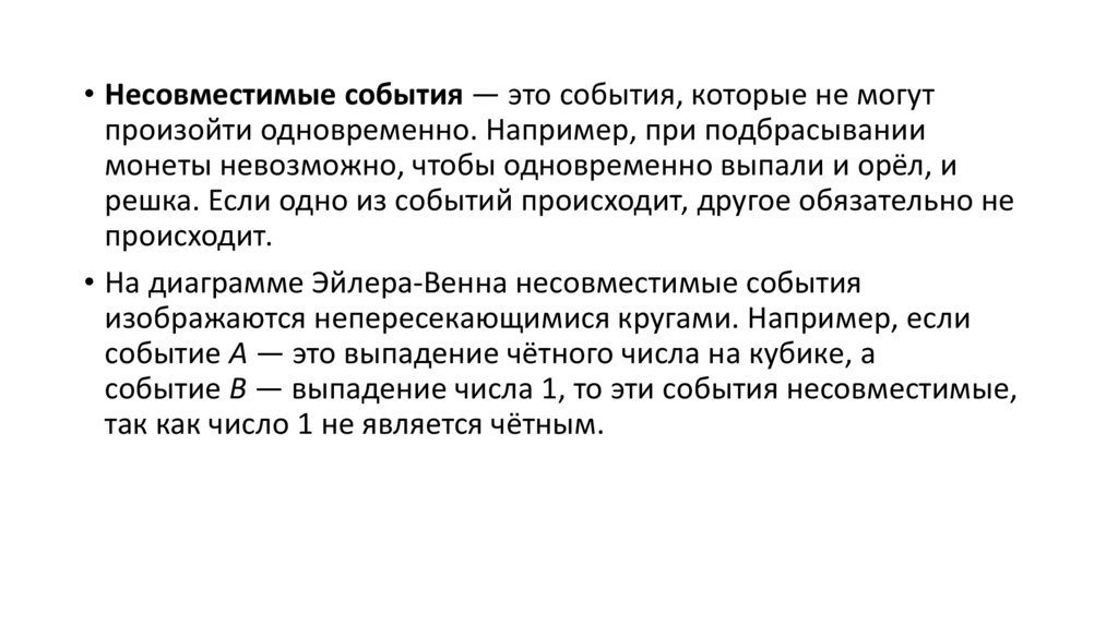 • Несовместимые события — это события, которые не могутпроизойти одновременно. Например, при подбрасывании