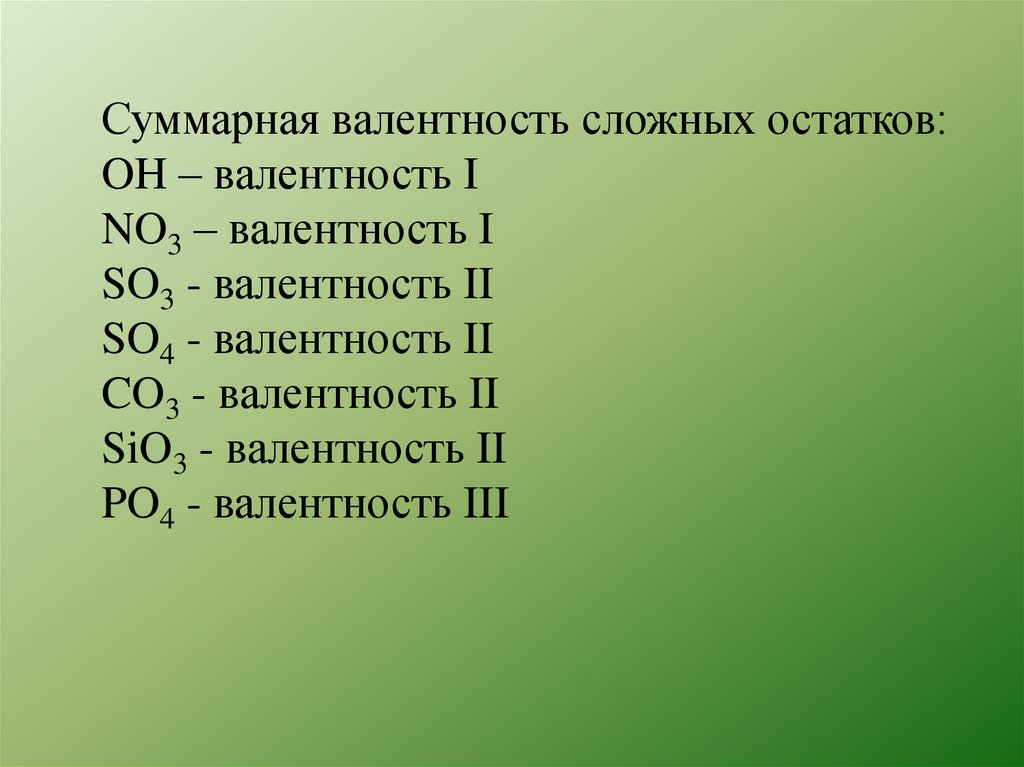 Суммарная валентность сложных остатков:OH – валентность I
