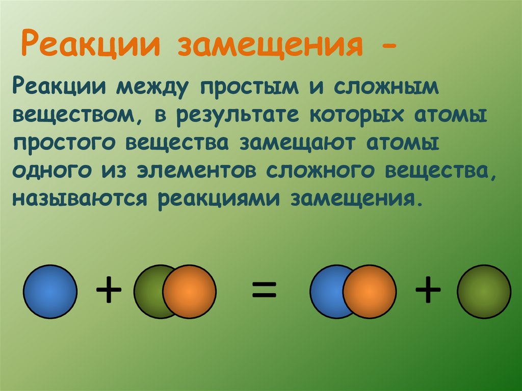 Реакции замещения Реакции между простым и сложнымвеществом, в результате которых атомы