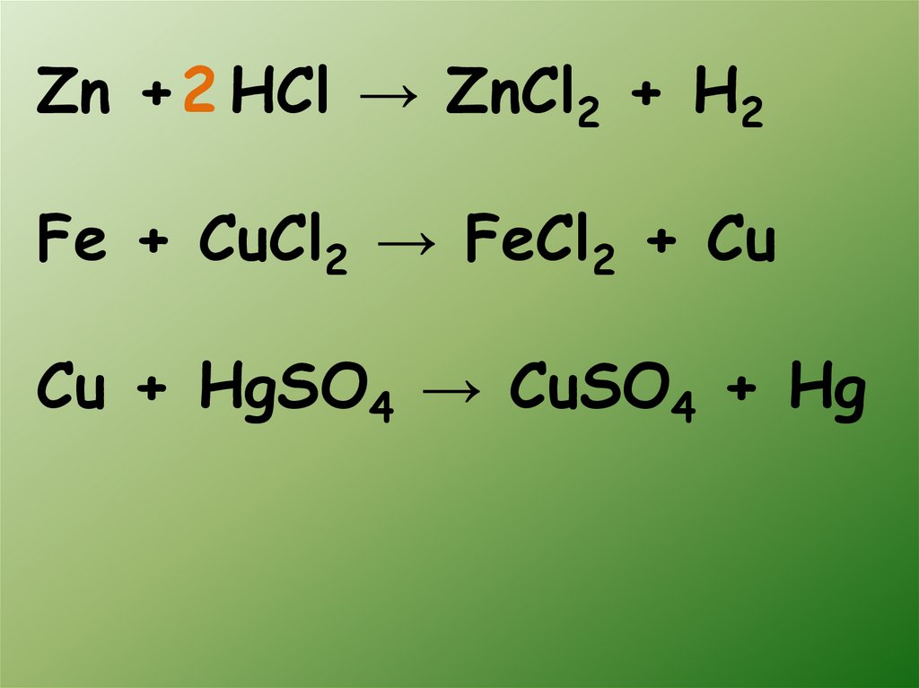 Zn + 2 HCl → ZnCl2 + H2Fe + CuCl2 → FeCl2 + Cu