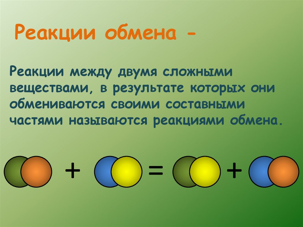 Реакции обмена Реакции между двумя сложнымивеществами, в результате которых они