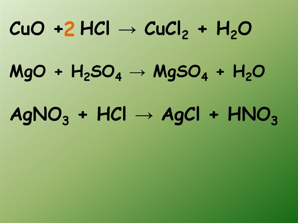 CuO +2 HCl → CuCl2 + H2OMgO + H2SO4 → MgSO4 + H2O