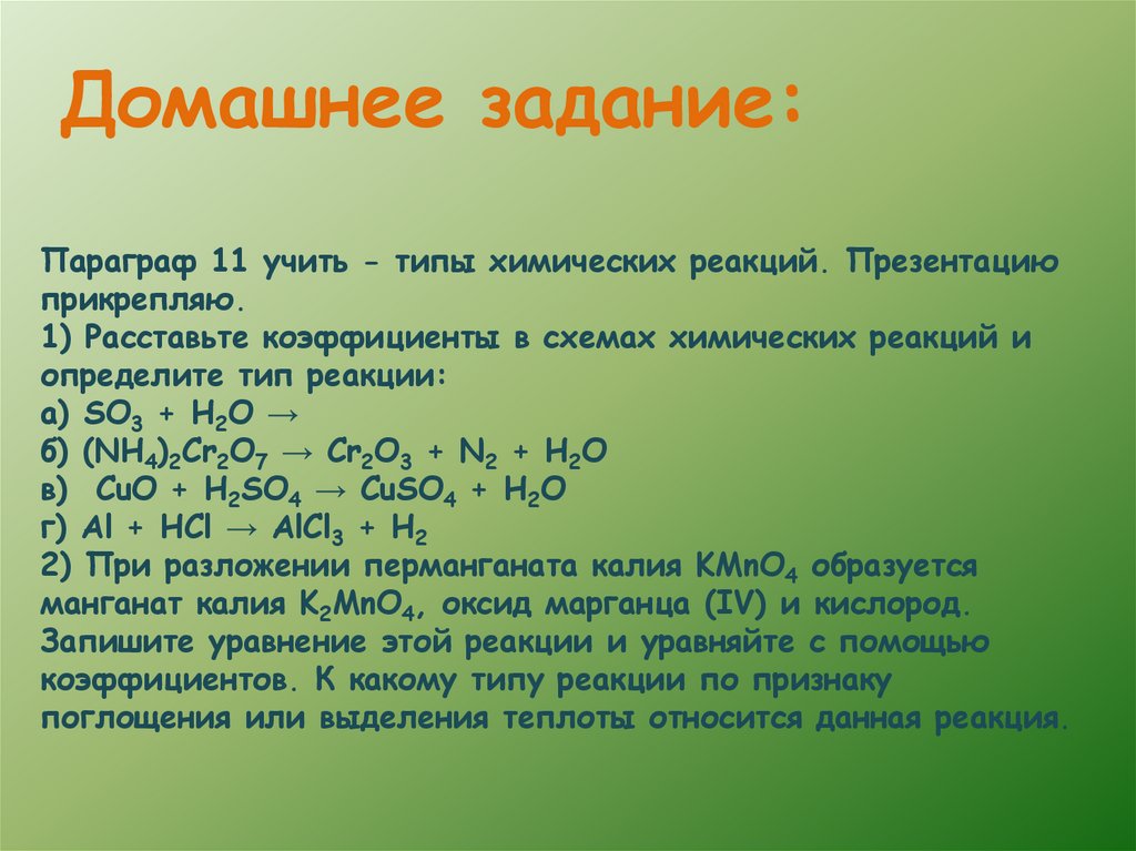 Домашнее задание:Параграф 11 учить - типы химических реакций. Презентацию