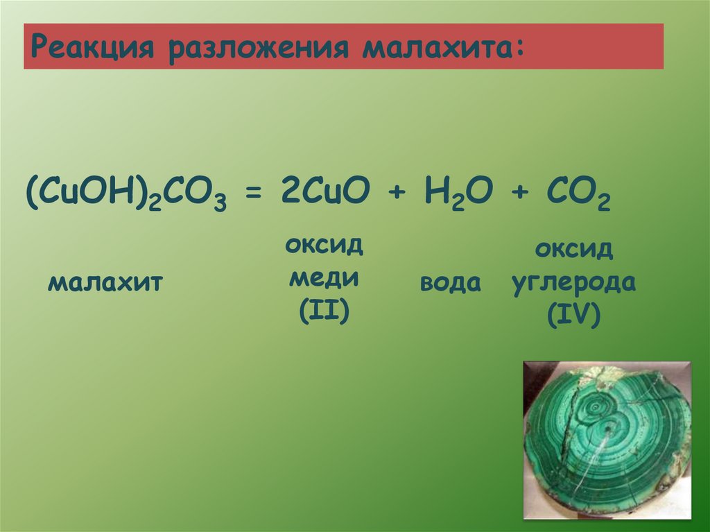 Реакция разложения малахита:(CuOH)2CO3 = 2CuO + H2O + CO2