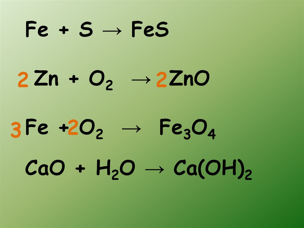 Fe + S → FeS2 Zn + O2 → 2 ZnO
