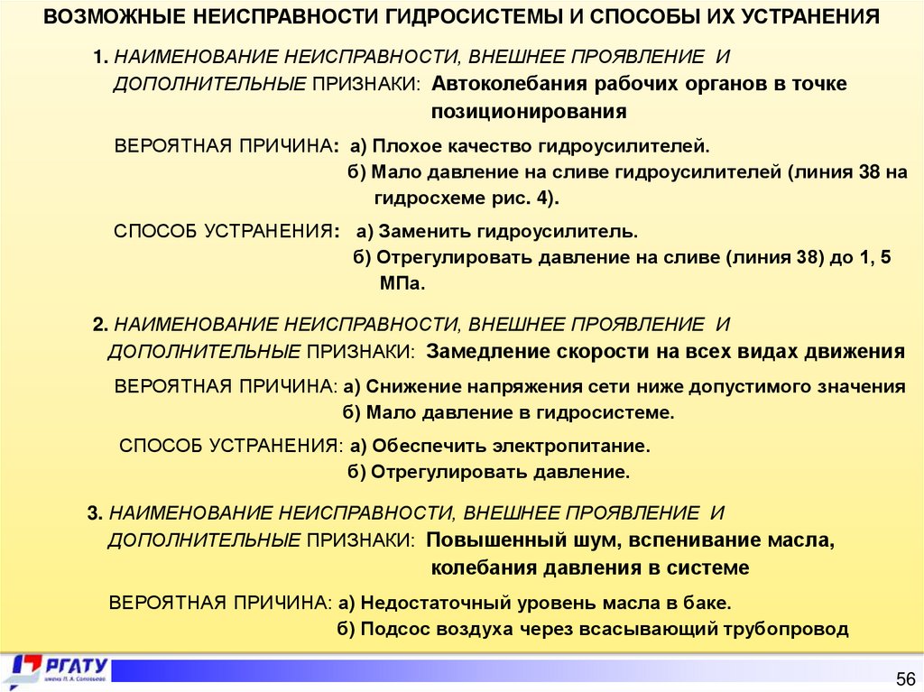 Также в работе рассмотрены возможные неисправности гидросистемы: автоколебания рабочих