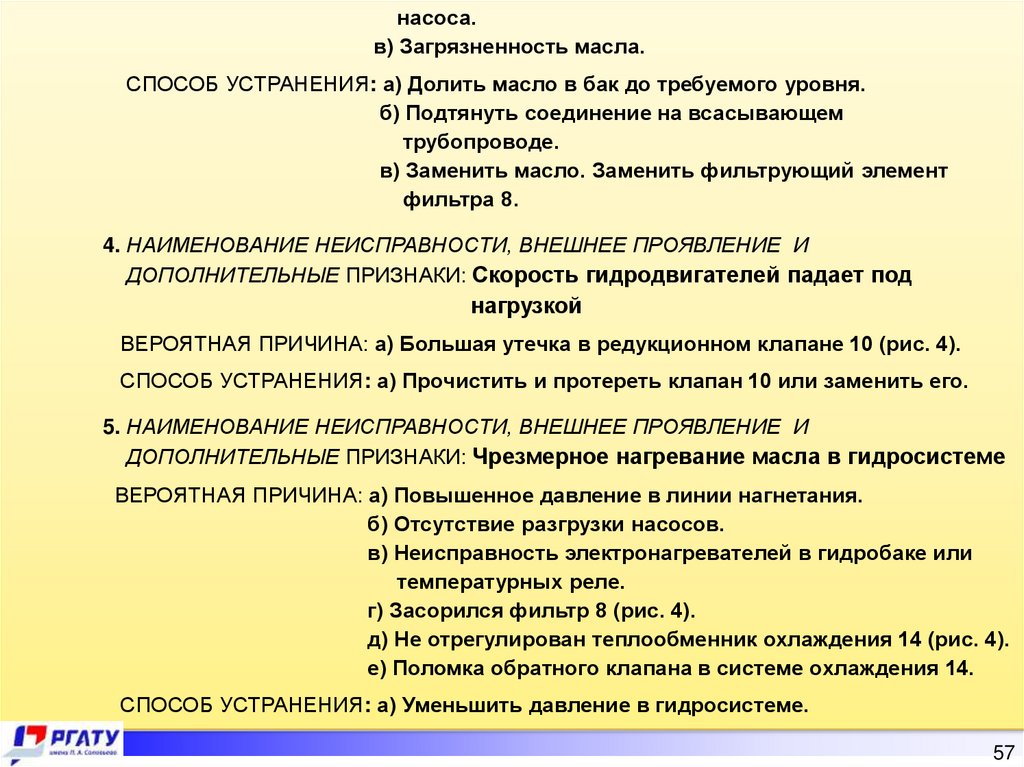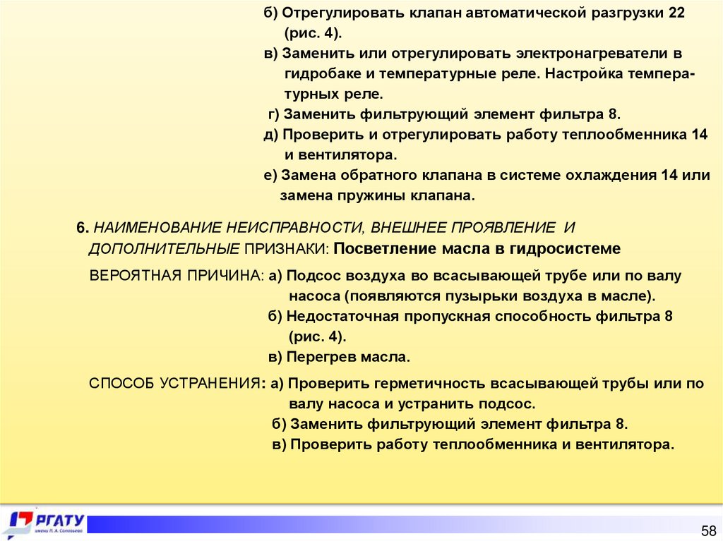 нагрузкой; чрезмерное нагревание масла в гидросистеме, а также посветление масла в