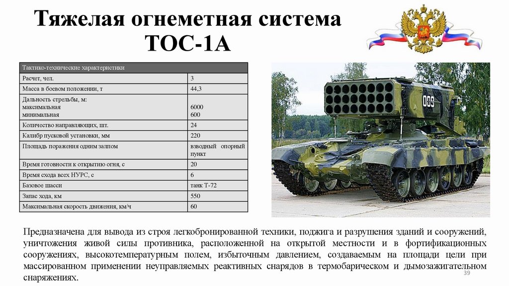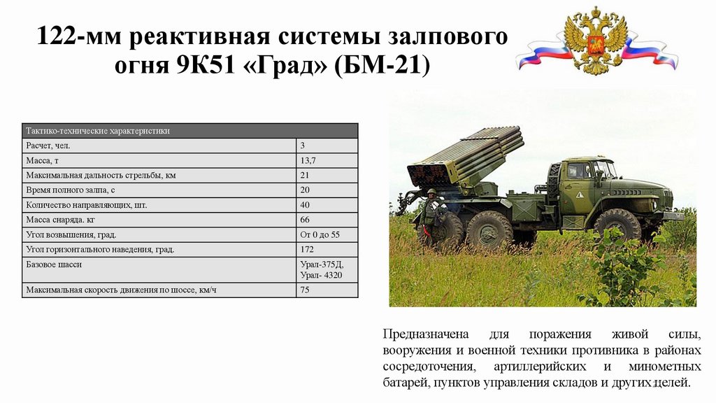 залпового огня 9К51 «Град» (БМ-21), тяжелая огнеметная система ТОС-1А, 5,45мм автомат Калашникова АК-74М.