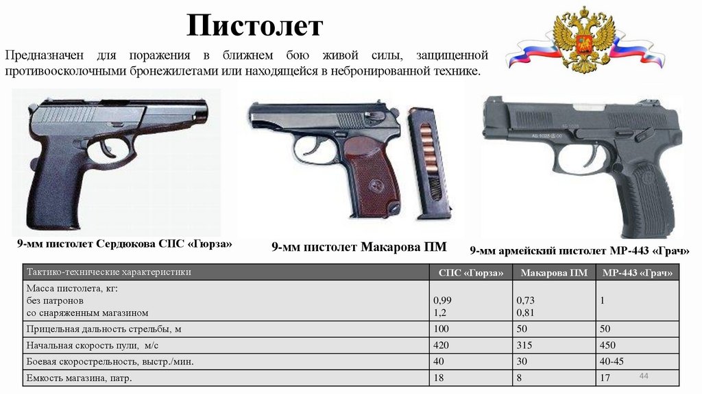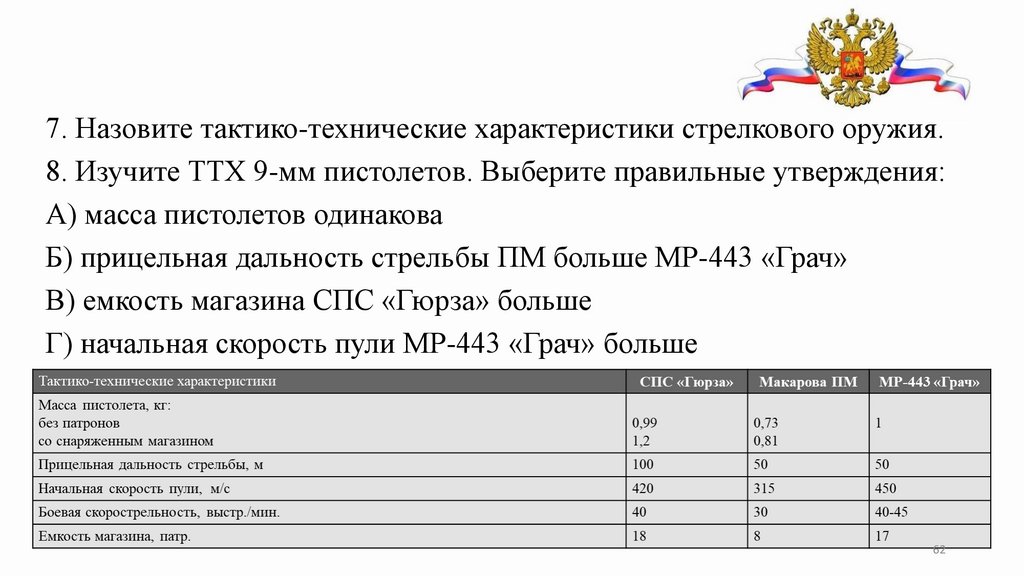 7. Назовите тактико-технические характеристики стрелкового оружия.8. Изучите ТТХ 9-мм пистолетов. Выберите правильные утверждения: