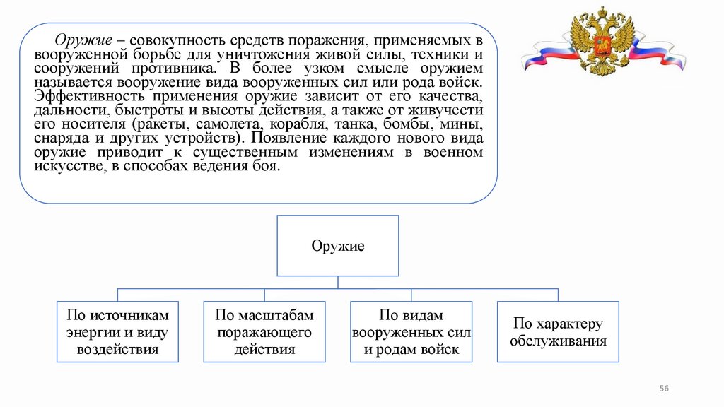 Оружие – совокупность средств поражения, применяемых ввооруженной борьбе для уничтожения живой силы, техники и