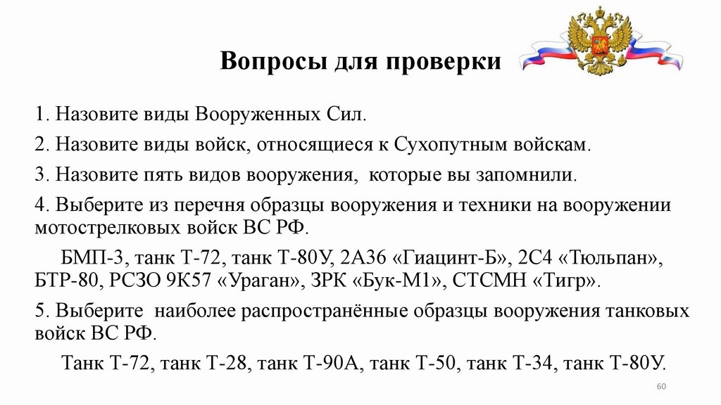 Вопросы для проверки1. Назовите виды Вооруженных Сил.
