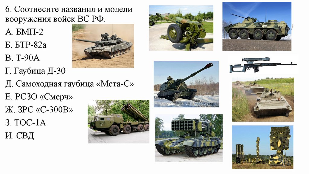 6. Соотнесите названия и моделивооружения войск ВС РФ.