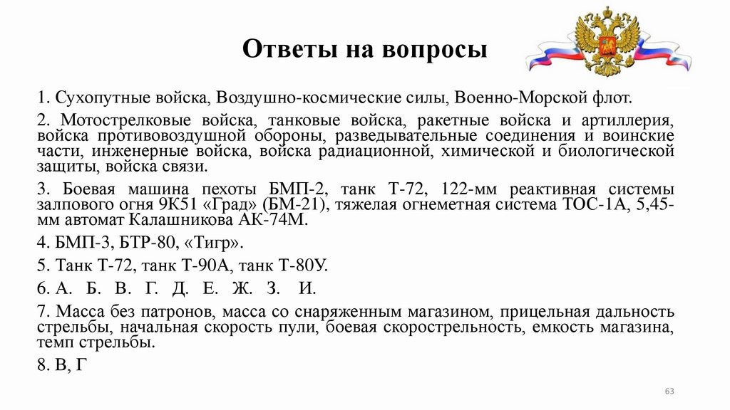 Ответы на вопросы1. Сухопутные войска, Воздушно-космические силы, Военно-Морской флот.