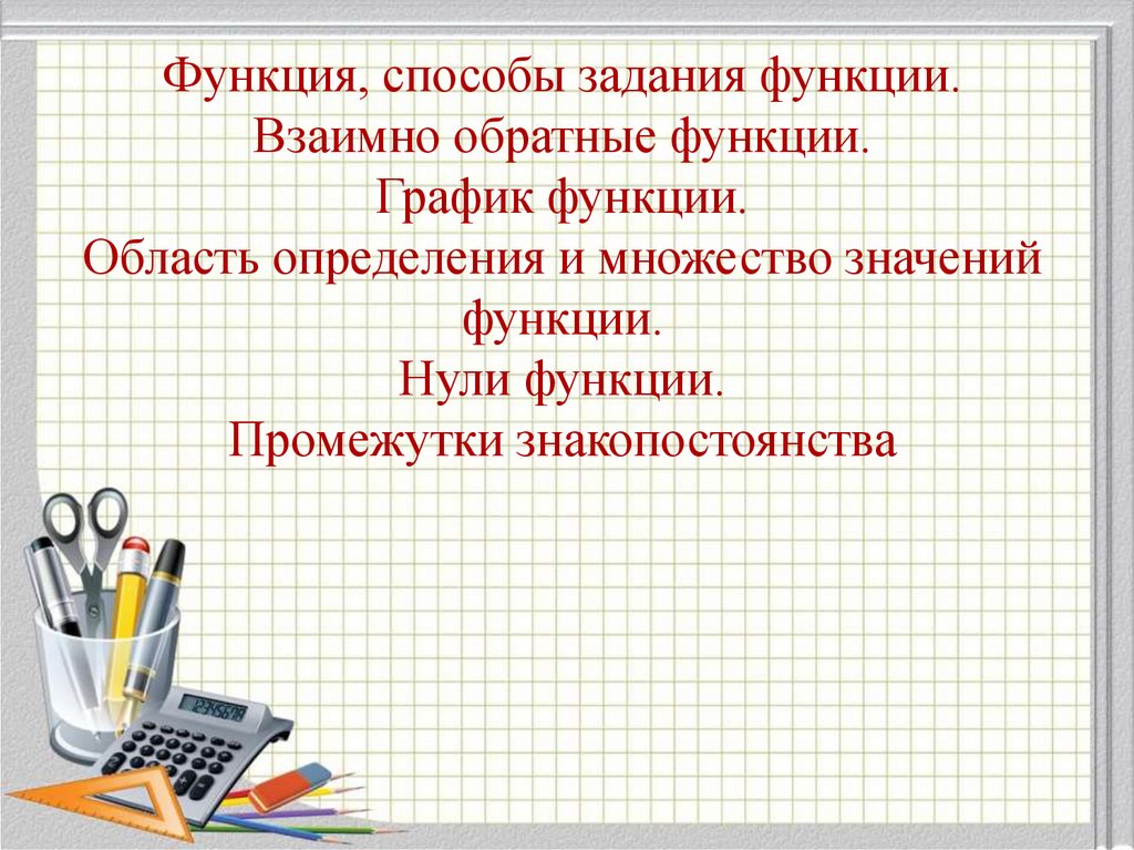 1. Функция, способы задания функции. Взаимно обратные функции. График функции. Область определения и множество значений функции.