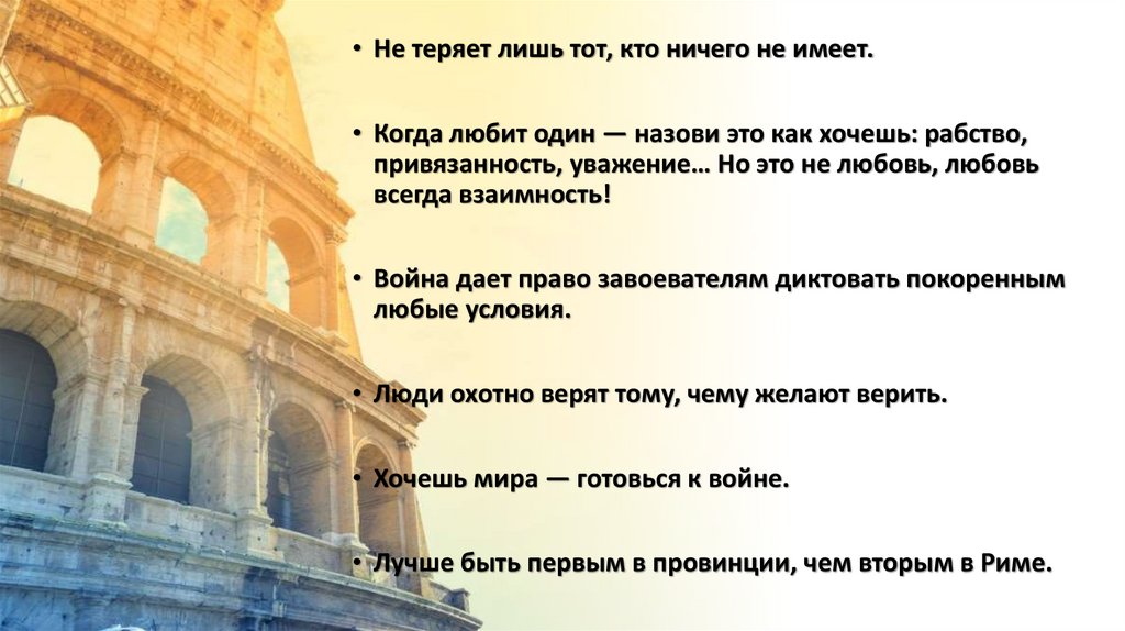 • Не теряет лишь тот, кто ничего не имеет.• Когда любит один — назови это как хочешь: рабство,