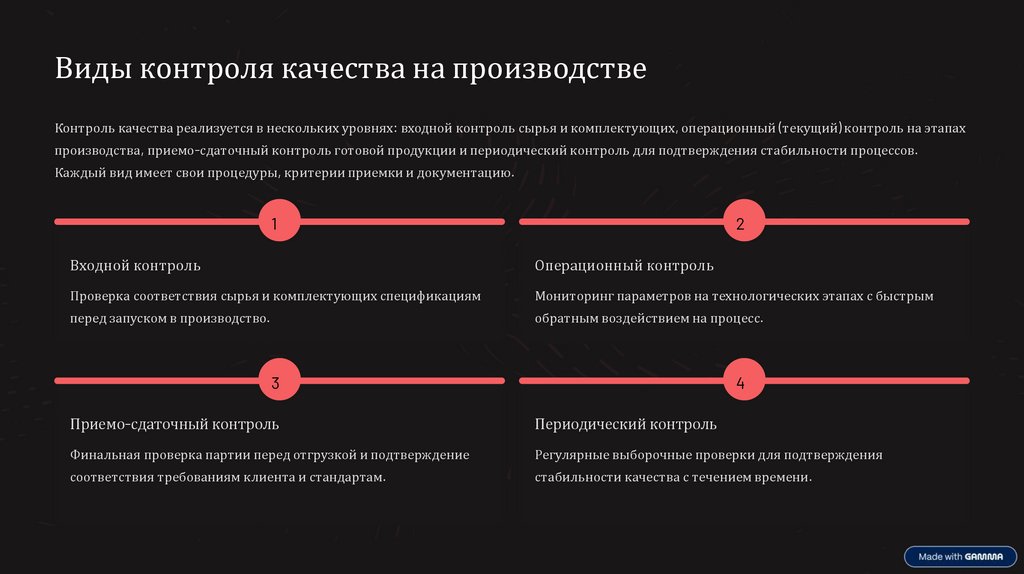Виды контроля качества на производствеКонтроль качества реализуется в нескольких уровнях: входной контроль сырья и комплектующих, операционный (текущий) контроль на этапах