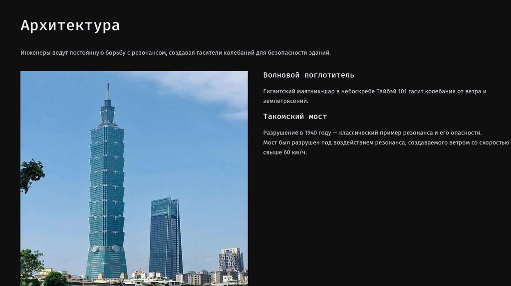 АрхитектураИнженеры ведут постоянную борьбу с резонансом, создавая гасители колебаний для безопасности зданий.