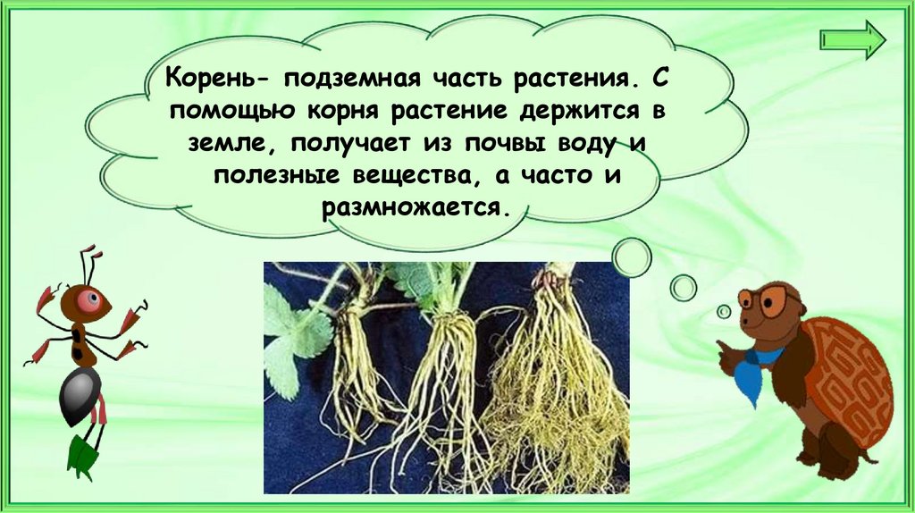 Корень- подземная часть растения. Спомощью корня растение держится в