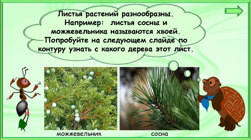Листья растений разнообразны.Например: листья сосны и