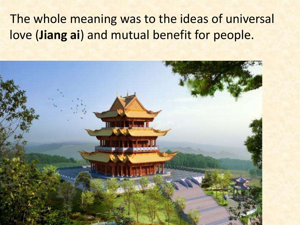 The whole meaning was to the ideas of universallove (Jiang ai) and mutual benefit for people.