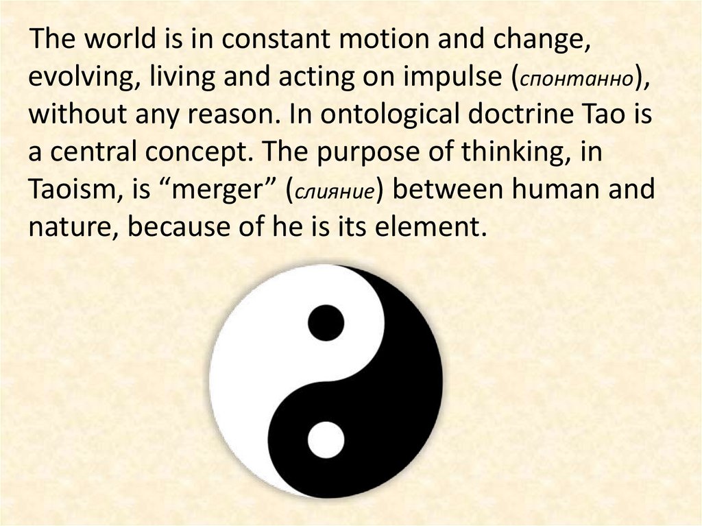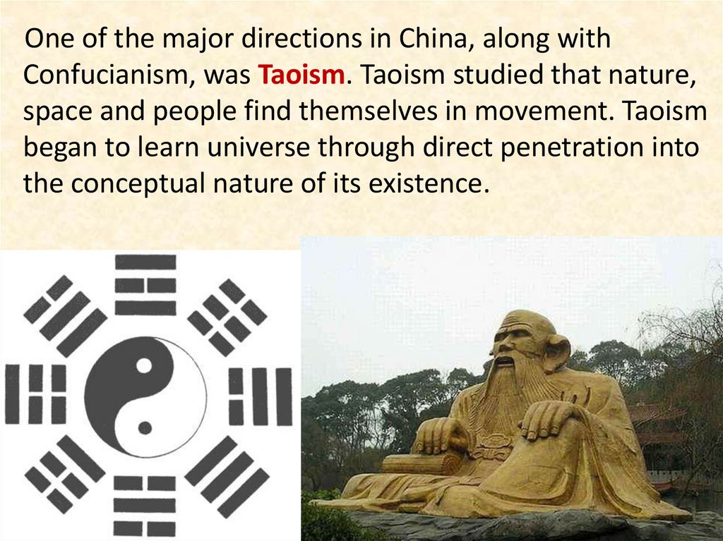 One of the major directions in China, along withConfucianism, was Taoism. Taoism studied that nature,