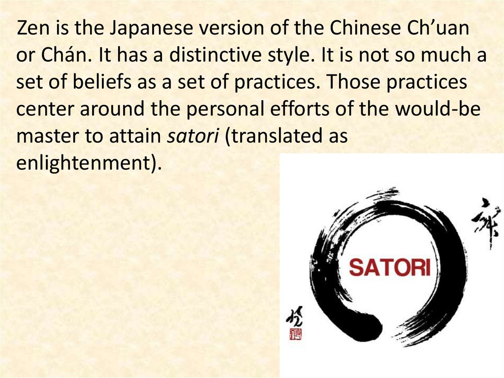 Zen is the Japanese version of the Chinese Ch’uanor Chán. It has a distinctive style. It is not so much a