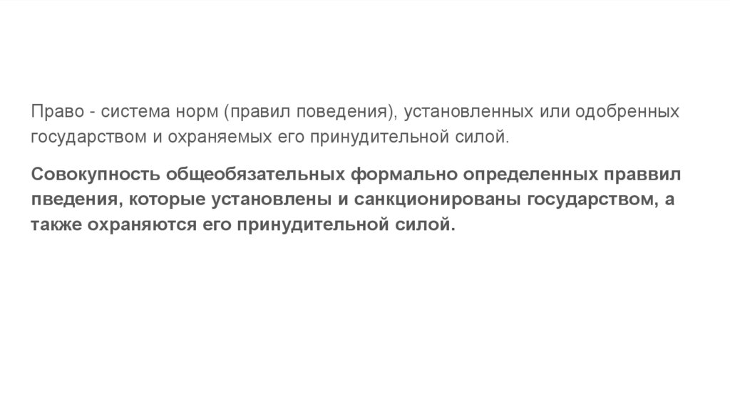 Право - система норм (правил поведения), установленных или одобренныхгосударством и охраняемых его принудительной силой.