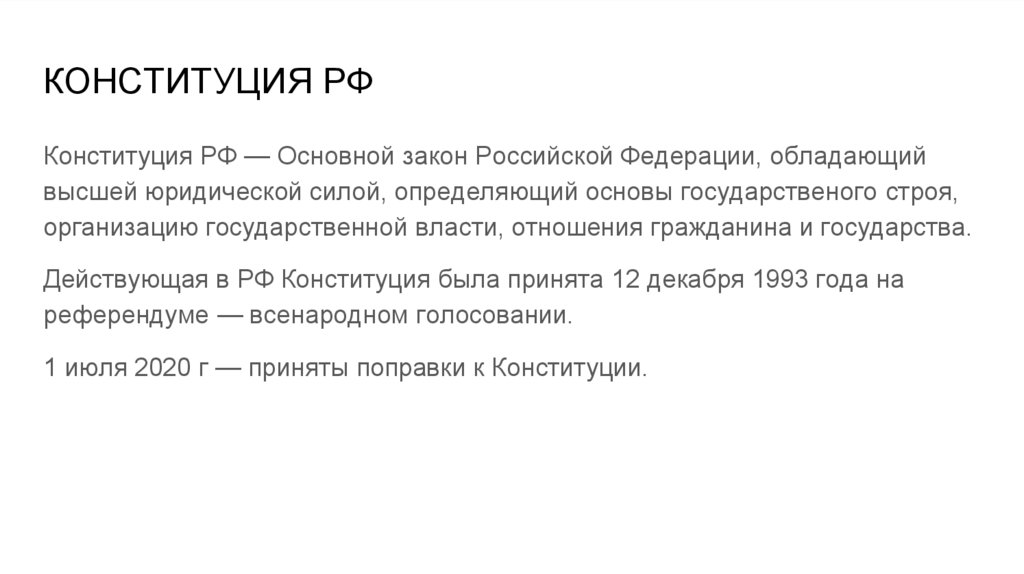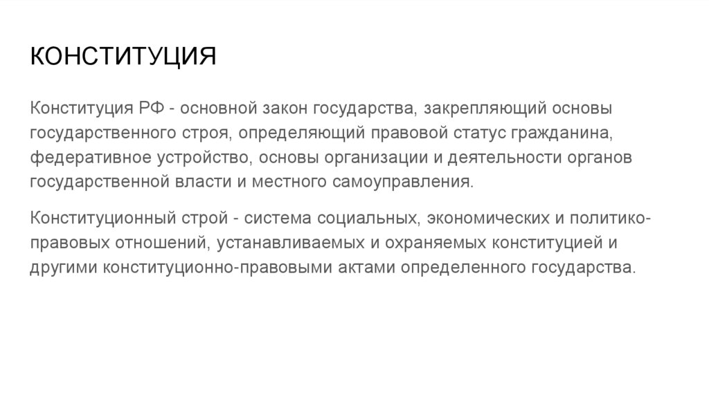 КОНСТИТУЦИЯ РФКонституция РФ — Основной закон Российской Федерации, обладающий