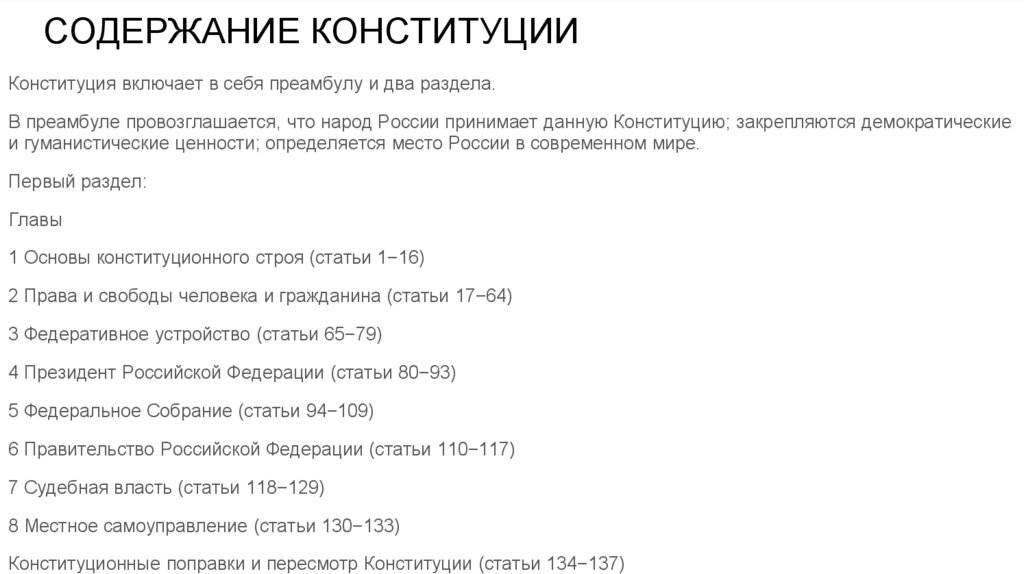 СОДЕРЖАНИЕ КОНСТИТУЦИИКонституция включает в себя преамбулу и два раздела.