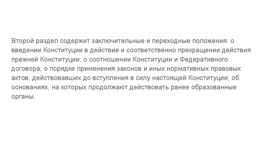Второй раздел содержит заключительные и переходные положения: овведении Конституции в действие и соответственно прекращении действия