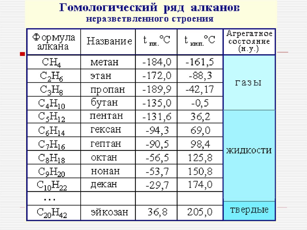 C4H10 — газы; с C5H12 до C13H28 — жидкости; после
