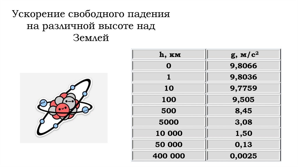 Ускорение свободного паденияна различной высоте над