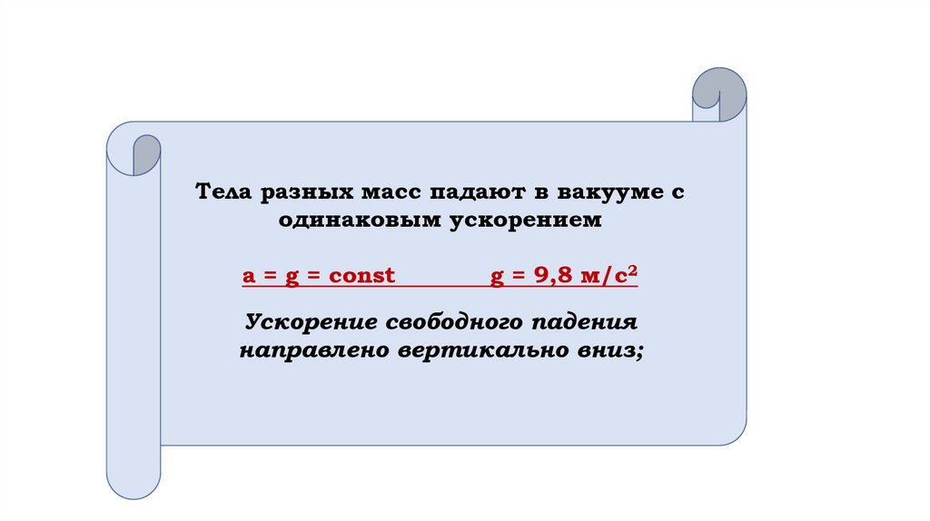 Тела разных масс падают в вакууме содинаковым ускорением